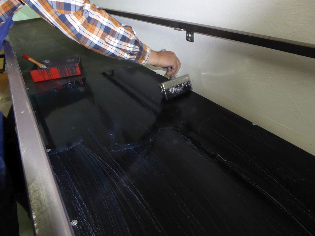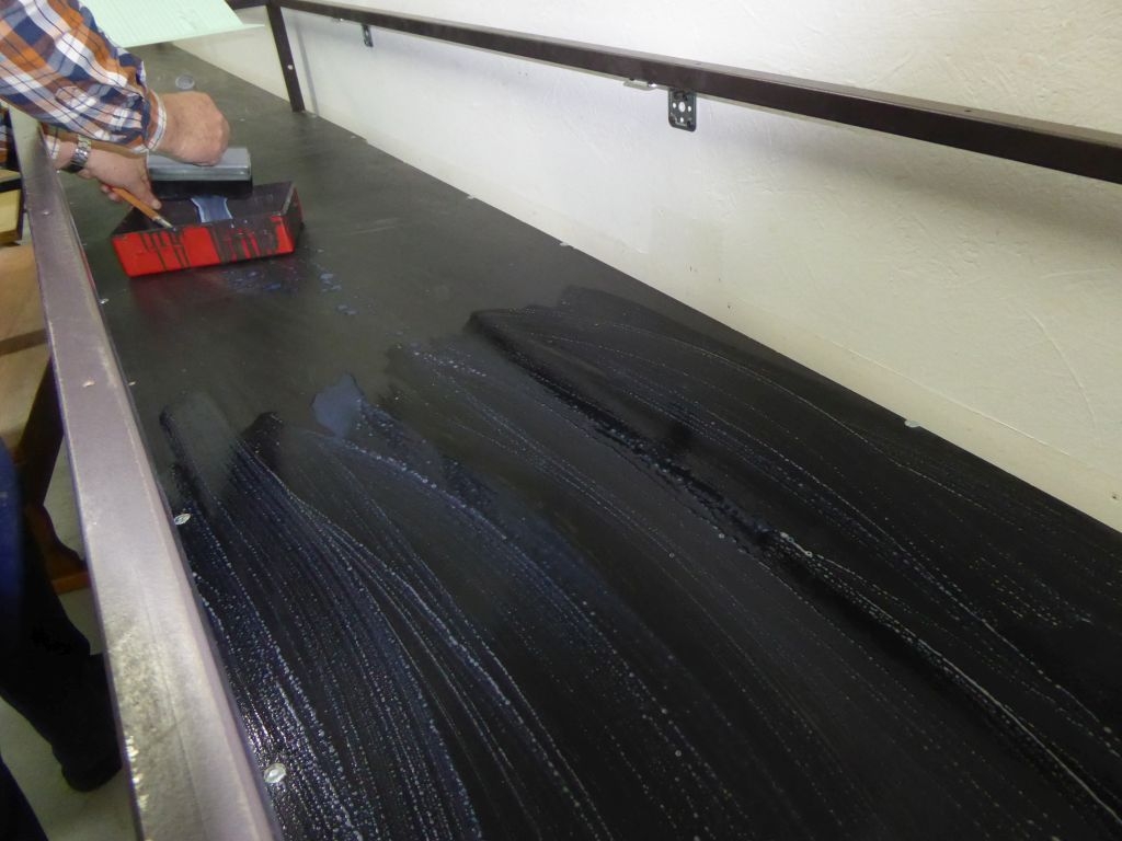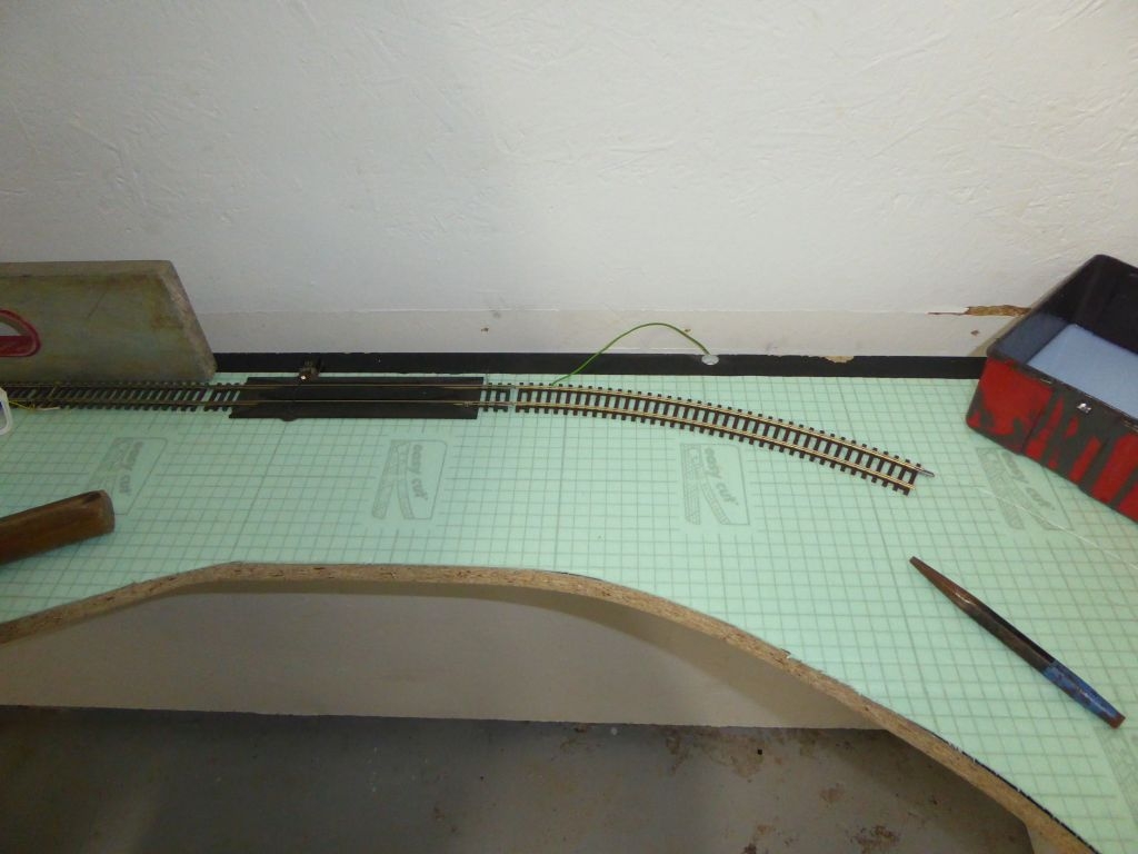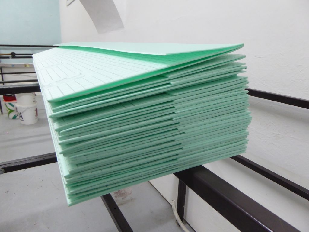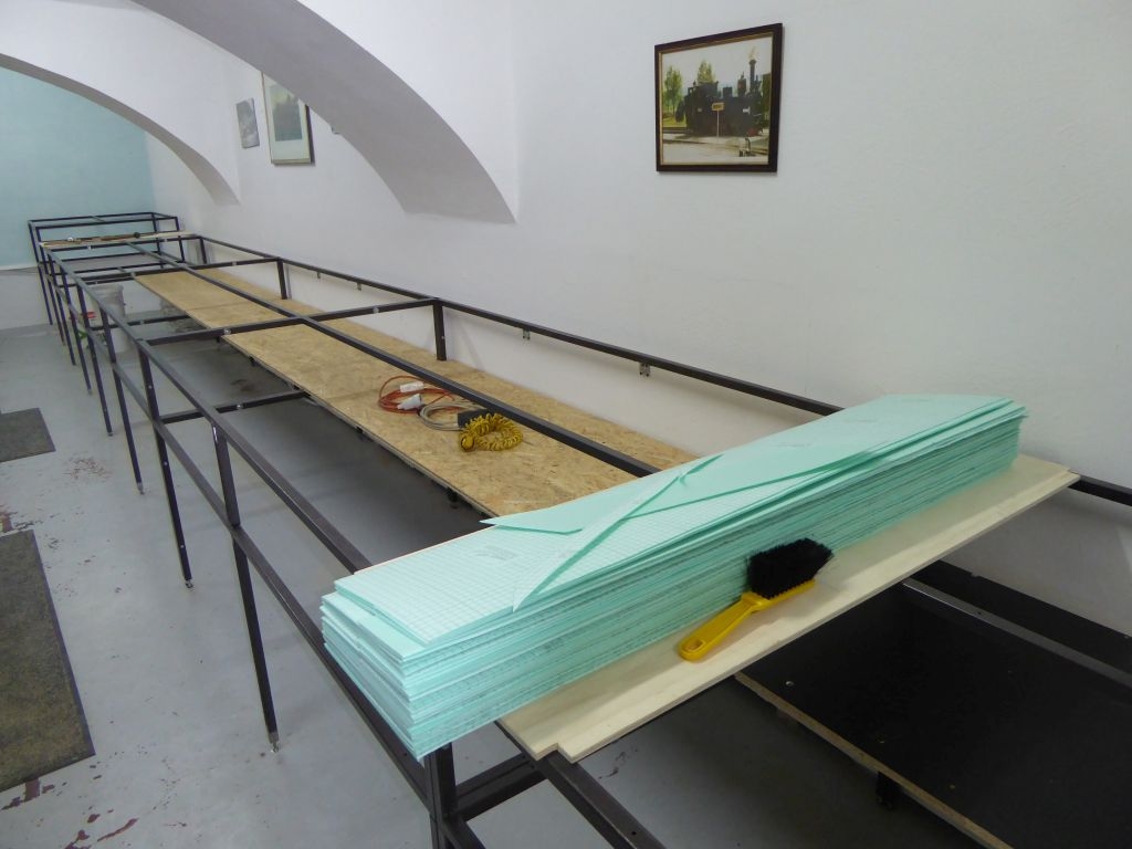 Als nächstes wurde auf die Holzplatten Tiefengrund aufgetragen. Darauf kamen dann die bereits zugeschnittenen Isolierungen. Nun, Ende Februar, war es nun soweit – die erste Schiene der neuen Anlage wurde an ihrem Bestimmungsort fixiert.